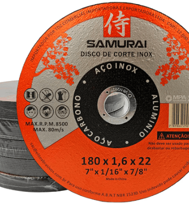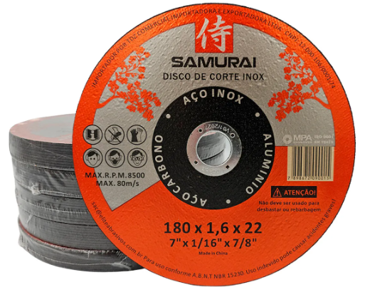 Disco de corte de inox e aço com diâmetro de 7 polegadas (180mm), espessura de 1/16 de polegada (1,6mm) e furo central de 7/8 de polegada (22,2mm). Possui 2 telas reforçadas do tipo T41 WA 2T, que conferem maior resistência e durabilidade ao disco. Sua velocidade máxima de rotação é de 8500 RPM e é vendido em um pacote com 10 unidades.